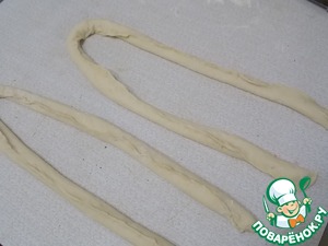 Затем от края начинаем соединять противоположные края, делая длинную колбаску.
