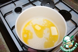Готовим заварное тесто. 130 мл воды вскипятить, распустить в ней 60 г масла (можно использовать хороший маргарин), добавить щепотку соли.