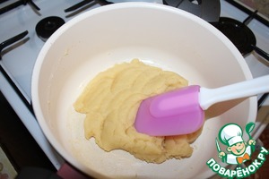 Всыпать 90 г муки и быстро перемешать, чтобы не было комочков. Удобно использовать при этом силиконовую лопатку. Снять с плиты, немного остудить.