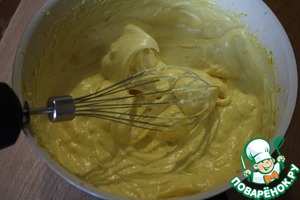 Так вот, нужно сначала сварить сироп. Обычно используют сахар и воду. Я рискнула и решилась на эксперимент, заменив сахар джемом "Махеев". Апельсиновый джем развести водой, добавить для цвета половину чайной ложки куркумы, размешать. На вкусе сиропа это никак не отразится, а цвет будет более яркий. -