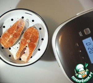 В мультиварку в специальный поддон укладываем рыбу, наливаем в чашу немного воды и ставим на режим "варка на пару" на 20 минут.