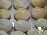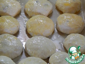 Выкладываем пирожки на смазанный маслом противень. Пирожки смазываем слегка взбитым яйцом и ставим в разогретую до 190 градусов духовку на 40 минут.