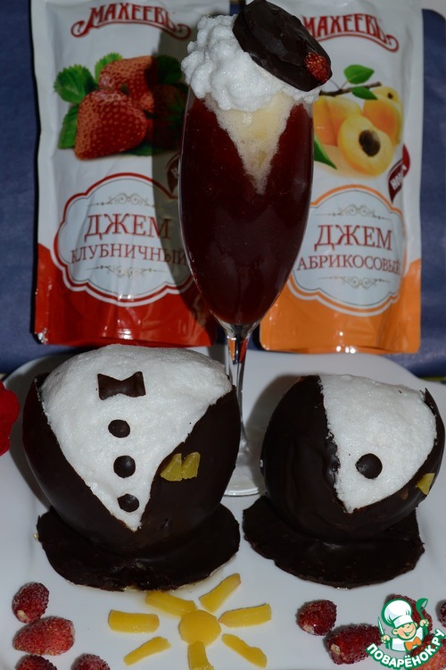 • В каждую шоколадную чашечку выложить немного мусса, положить одну чайную ложку абрикосового джема, сверху накрыть белковым муссом. Заполнить чашечки муссом, придавая им округлую форму. Для завершения шоколадной идеи, из шоколада сделать пуговицы, галстуки-бабочки, из персика платочки в кармашках.