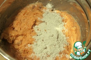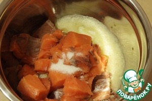 Взбить яйцо с солью. Добавить кусочки семги (настоятельно рекомендую именно семгу, биточки из нее получаются особенно нежные), нарезанный лук, соль.