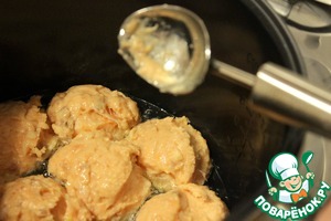 Включить мультиварку на режим "жарка", в чашу влить масло и выкладывать биточки. Фарш очень нежный, и я приспособила для этих целей ложку для мороженого, смачивая ее холодной водой.