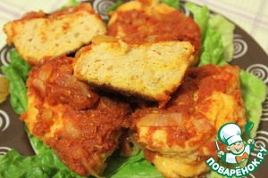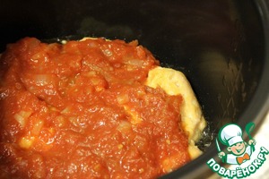 Выкладываем на биточки томатный соус (приготовьте его заранее: просто обжарьте измельченный лук, присолите, а затем добавьте томаты, готовьте 2 минуты), добавляем 2 ст. л. воды. Закрываем мультиварку, переставляем режим на "мультиповар" на 130 градусов на 15 минут.