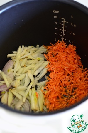 Лук и морковь нарезать соломкой и быстро обжарить со специями около 5 минут.