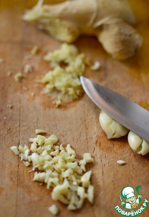 Снова добавить ложку масла и, пока оно нагревается, натрите имбирь и порубите чеснок.