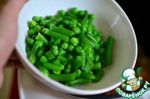 Теперь нужно обдать кипятком замороженную фасоль и зеленый горошек, отставить на время в сторону, а мультиварку включить в режиме Поджаривание и налить туда ложку масла.