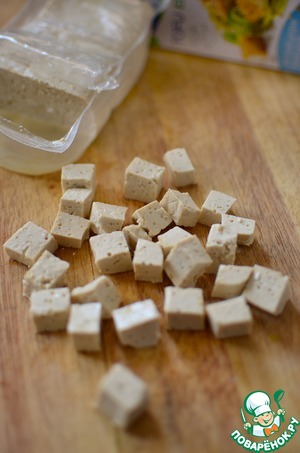 Тем временем нарежьте тофу кубиками. Тофу - это вообще уникальный продукт, его еще называют "мясо без костей"-богатейший источник легкоусвояемого белка. Не имеет ни запаха, ни вкуса, поэтому как губка впитывает вкусы и запахи других продуктов.
