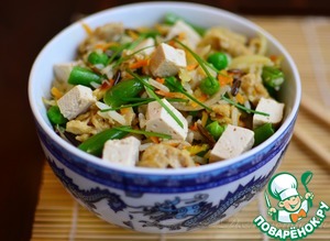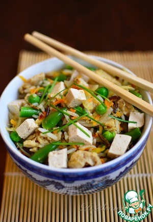 Выложите готовый рис на блюдо и сверху аккуратно разложите тофу.