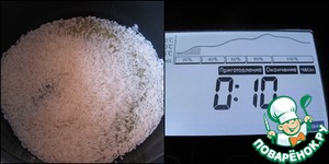 Добавить к рису воду и соль, включить режим "Рис", выбрать подпрограмму "Рассыпчатый", время - 25 минут.