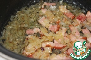Бекон режу полосками, лук - кубиками и обжариваю до прозрачности лука. Моя мультиварка прекрасно справляется с обжариванием продуктов