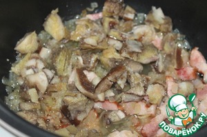 Затем добавляю грибы (белые мороженые порубила кусочками) и продолжаю жарить до выпаривания жидкости