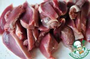 Для приготовления берём потроха птицы. Я использовала утиные и гусиные сердце и желудки. Нарезаем субпродукты тонкими полосками.