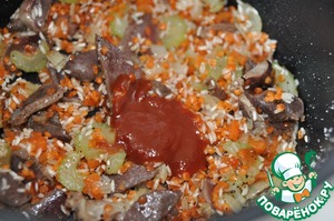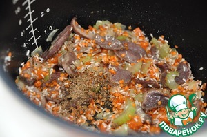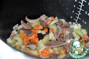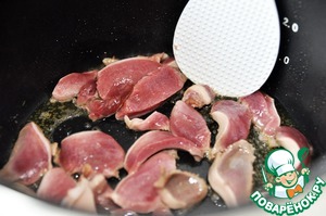 В чашу мультиварки наливаем растительное масло, кладём нарезанные субпродукты, поджариваем 7-8 минут, помешивая лопаткою.