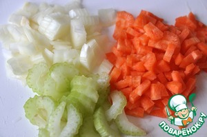 Нарезаем кубиками морковь и лук, полосками сельдерей.