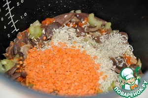 Отмеряем мультистаканами рис и чечевицу. Я брала длиннозёрный рис и красную колотую чечевицу. При необходимости промываем. Кладём в чашу мультиварки. Перемешиваем.