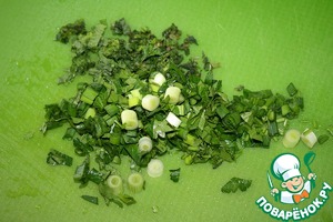 Мяту, зеленый лук и петрушку мелко режем