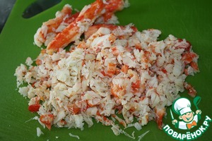 Мясо краба режем не сильно крупно