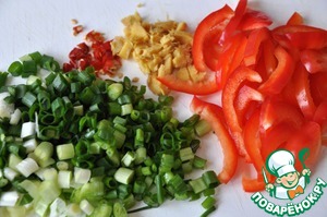 Зелёный лук нарезаем колечками, болгарский перец полосками, мелко режем имбирь и жгучий красный перец.