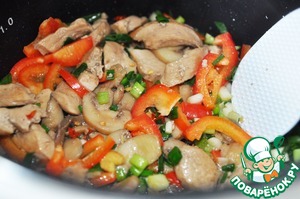 Кладём овощи в чашу мультиварки, солим (осторожно, куриные грудки солёные от соевого соуса), добавляем свежемолотый перец, перемешиваем, обжариваем 3-4 минуты.