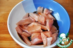 Берём куриную грудку или филе, нарезаем тонкими полосками и заливаем соевым соусом, ставим в холодильник мариноваться.