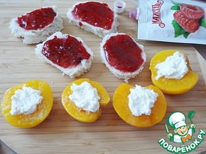 Сложный изысканный десерт можно приготовить за несколько минут. Печеные персики, начиненные рикоттой, уложены на хлебные ломтики, намазанные джемом и пропитанные сиропом с бренди...