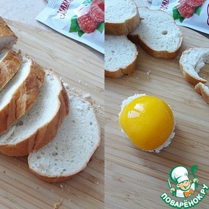 Нарезать батон ломтями толщиной около 2см. Из батона вырезать 4 круга по размеру персика.