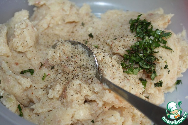 Перекладываем фарш в чашку, добавляем к нему черный перец, мелко нарезанный базилик и тимьян. Дать фаршу постоять полчаса, чтобы манка и мука разбухли и "склеили" фарш