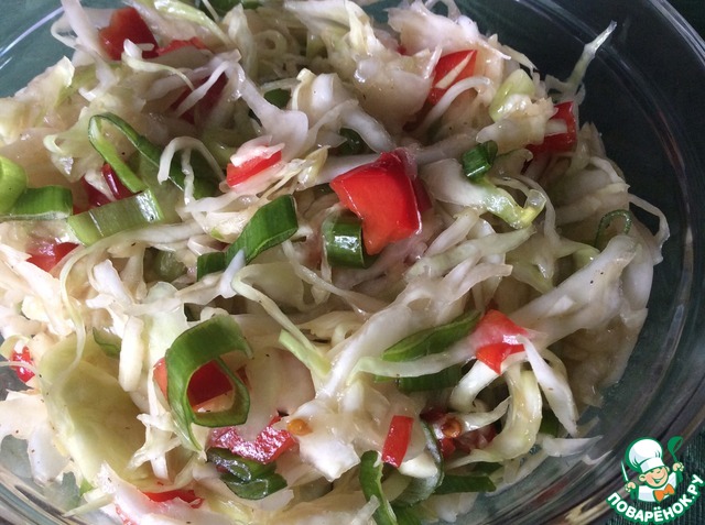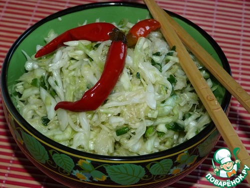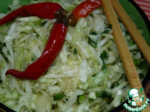Для любителей корейских салатов и не только. Вариантов салатов из свежей капусты много, предлагаю еще один (из брошюры "Корейские салаты. Рецепты для Вас", 2005 г. издания). Данный рецепт мне нравится минимальным количеством ингредиентов и простотой приготовления. И, по-моему скромному мнению, корейские салаты из овощей отлично могут разнообразить меню постящихся. А кто не любит (или по некоторым причинам не может) слишком острую еду, то вполне возможно салат сделать менее острым, достаточно лишь уменьшить количество чеснока и перца.