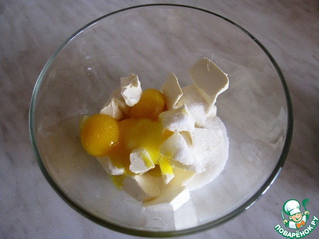 Для первого шага нам понадобятся: маргарин, желтки, 3 ст. л. сахара, щепотка соли, мука и разрыхлитель