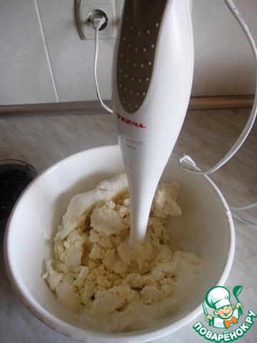 Для следующего этапа нам понадобятся: творог, 7 ст. л. сахара, щепотка соли и сметана. Все это вымешиваем ручным блендером до пастообразного состояния.