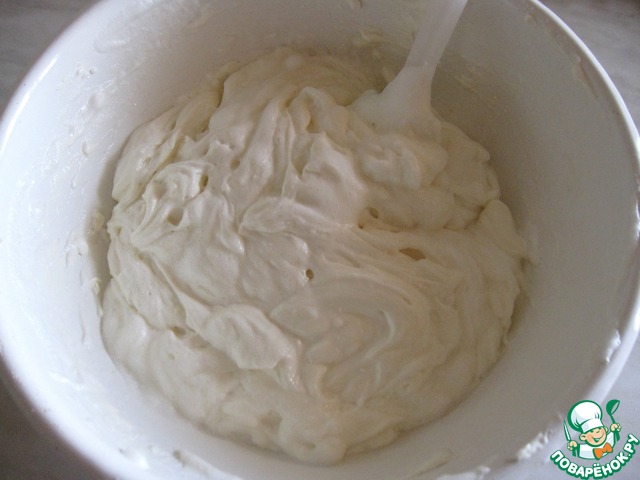 В три приема вводим взбитые белки к творожному наполнителю. Осторожно перемешиваем лопаткой снизу вверх и по часовой стрелке. Получаем такую вот воздушную массу.