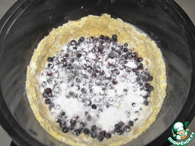 Равномерно распределяем ягоду по дну основы и присыпаем ложкой сахара и ложкой крахмала. Это нужно для того, чтобы сок ягоды не растекался, а стабилизировался. -