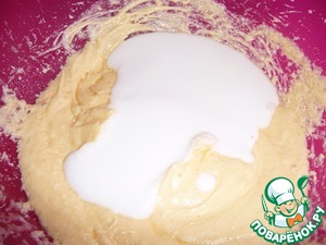 В полученную массу влить кефир и взбить.