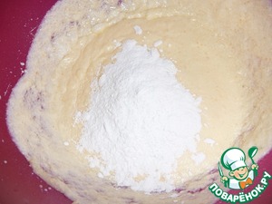Муку смешать с разрыхлителем, просеить, добавить в массу и взбить.