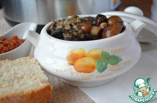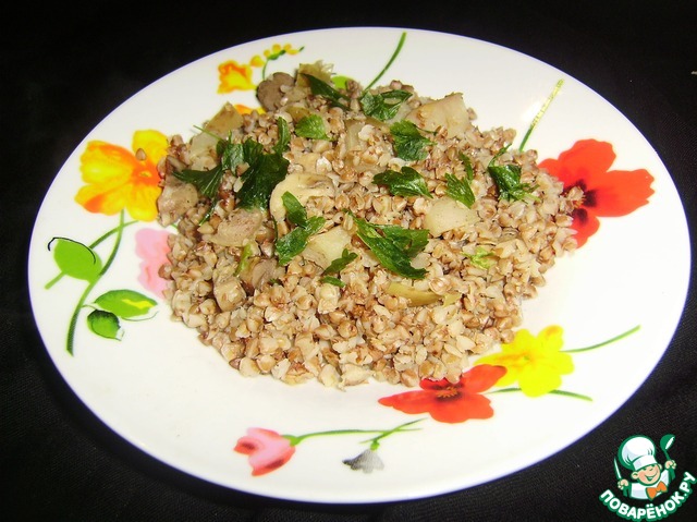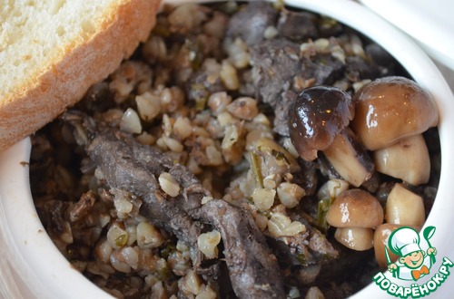 Вкусная гречневая каша с печенью, сушеными грибами и яблочками готова!