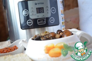 Включить мультиварку Vitek VT-4210ВК в режим "Поджаривание", налить растительное масло. Спассеровать немного в нем лук. Грибной отвар слить в отдельную емкость (он нам пригодится), грибы измельчить ножом и добавить пассероваться к луку. -