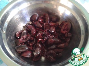 Оливки освободить от косточек ( если с косточками), порезать на половинки.