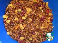 Остужаем смесь и высыпаем сухие (!) изюм и клюкву, перемешиваем.