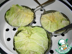 3 листа капусты бланшировать в кипятке 3-5 минут, либо поставить в микроволновку на 3-5 минут (смотрите по капусте)
