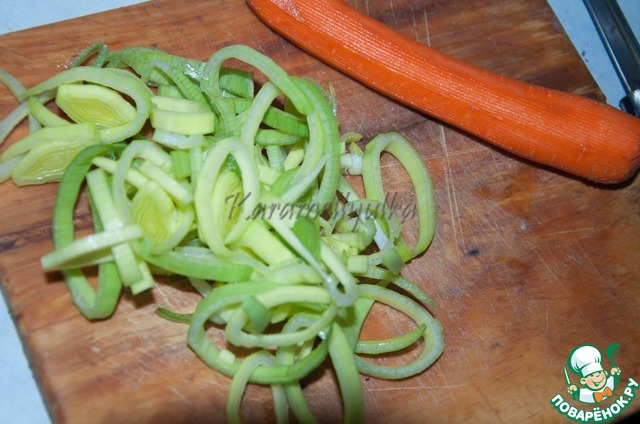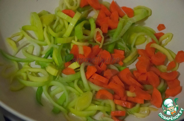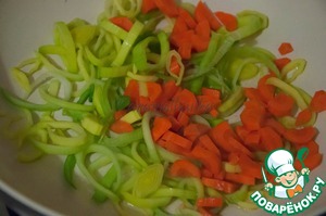 Нагреть предварительно сковороду глубокую, налить масло и положить лук с морковью, слегка припустить.