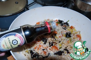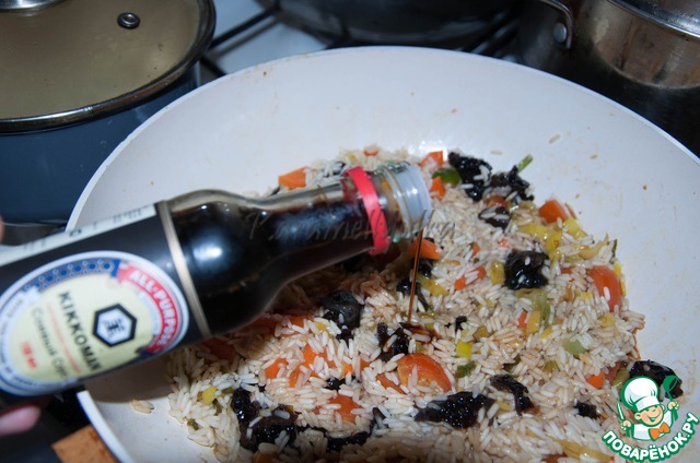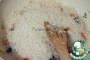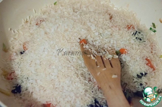 Предварительно промыть и просушить рис. Добавляем в овощи