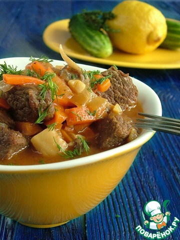 Как только овощи стали прозрачными и покрылись маслом, вернуть в кастрюлю мясо, перемешать. Добавить лавровый лист (я еще добавила тимьян).