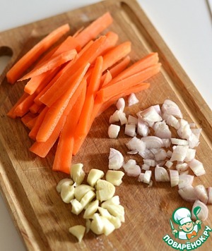 Морковь, лук и чеснок очистить. Морковь нарезать брусочками, а лук и чеснок - кубиками.