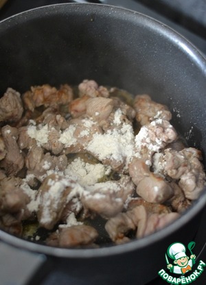Затем добавить муку, размешать. Выложить мясо на блюдо.