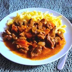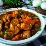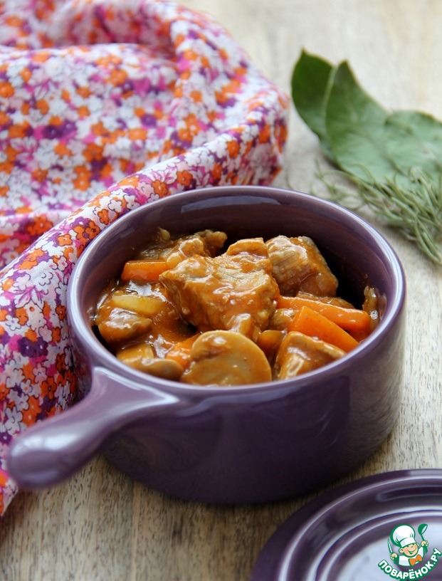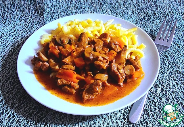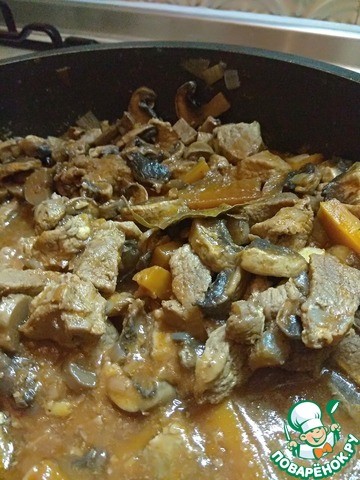 Затем добавить нарезанные шампиньоны и продолжить тушение около 45-60 минут, чтобы мясо стало мягким. Попробуйте соус на вкус, возможно, нужно будет досолить и поперчить.