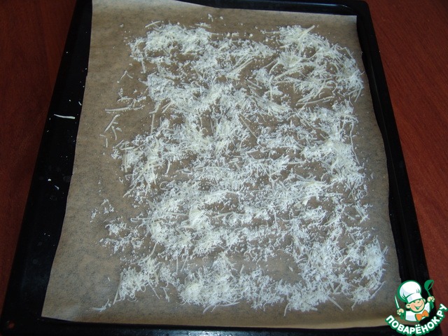 Возьмите еще один лист бумаги для выпечки, если нужно, смажьте его оливковым маслом и посыпьте оставшимся тертым пармезаном.