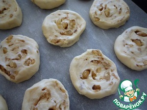 Орех слегка придавить в тесто. Осторожно свернуть рулет.
